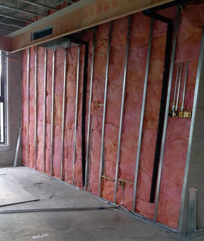 (9)鋪放墻體內(nèi)的玻璃棉。礦棉板、巖棉板等填充材料,與安裝另一側(cè)紙面石膏板同時進行,填充材料應(yīng)鋪滿鋪平。